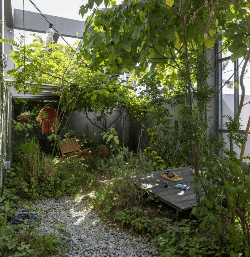 On a 23rd floor penthouse, a hidden little forest is growing on shallow soil. The humans sleeps, surrounded by this forest. Or maybe it will be nicer to sleep in the forest, watching the night sky. They awake from the sound of morning birds or an insect crawling around. At midday, a carpenter bee and butterfly finds themselves on this high floor collecting nectar. Why did it fly so high? Why is there a grasshopper here too? A human visits and observed it doesn’t fell like the 23rd floor.