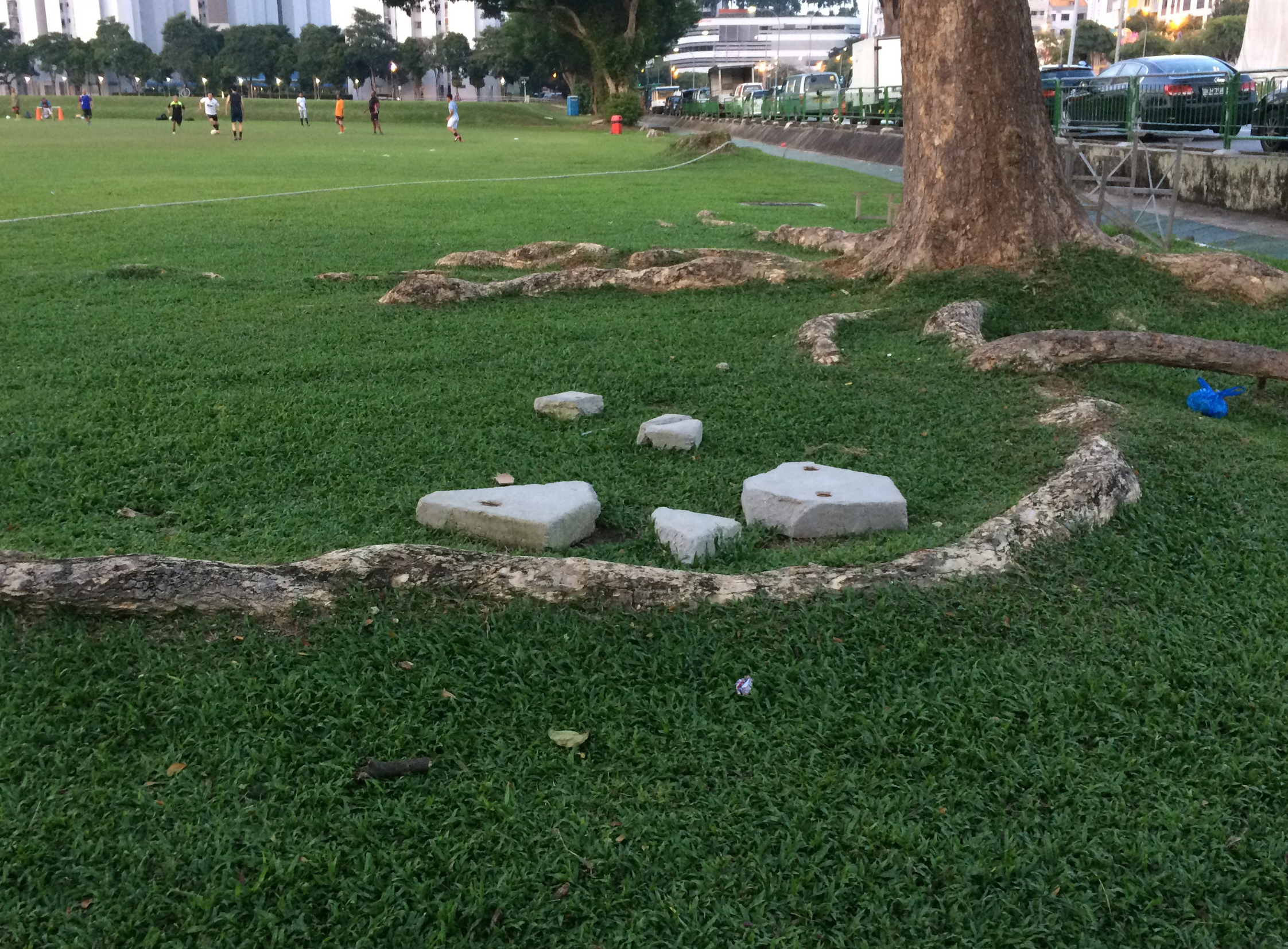 In the constant heat of the day, shadow spots become desirable as spaces of rest. Under favourable conditions, a quick rest space may evolve into a long-term one. A dweller may start to place a make-shift seat under a shady tree. This can be developed over time by themselves or by a group. We can observe them under trees next to open sports fields. They may look accidental during the day, but on evenings or weekends the logic of the arranged structures will make more sense. In the tropics, as long as there are shadows, there will always be activities.