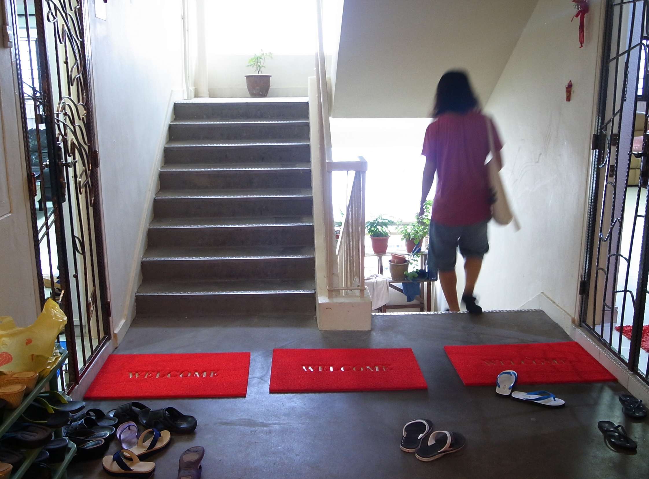 Over a period of time, apartment dwellers comfortable with their neighbourhood (and neighbours) may build their presence in the public corridors. A dweller may start by leaving their shoes or adding a dust mat, a sign of trust that it will not be stolen. After this initial gesture, it is then up to the decision of each individual dweller on how to expand. Sometimes an extension of the living room is build. If a family member becomes a neighbour, the indoor spaces of both dwellers may even extend to occupy the whole public corridor.