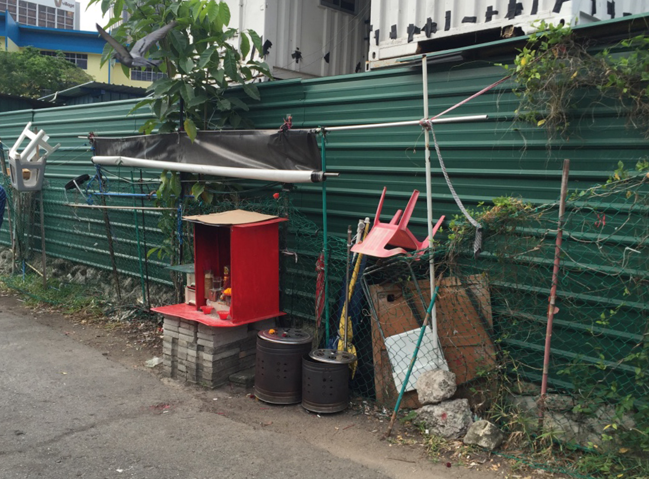 A self-built is not always about satisfying a practical function. Sometimes they are built to be purely decorative in a mundane public space. The need for beauty is important. These pavilions may develop due to a person spending long hours in a public spot. Such examples can be seen easily at security posts, hawkers or street vendors. They may also develop due to a person’s need to constantly visit the same public spots throughout the day. This may be due to work or a habit. Examples are taxi uncles’ resting spots, delivery drivers’ nap spots, or smoking corners. Sometimes these pavilions are also to house shrines or prayer spaces that have developed in public spaces over time.