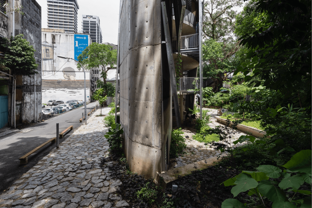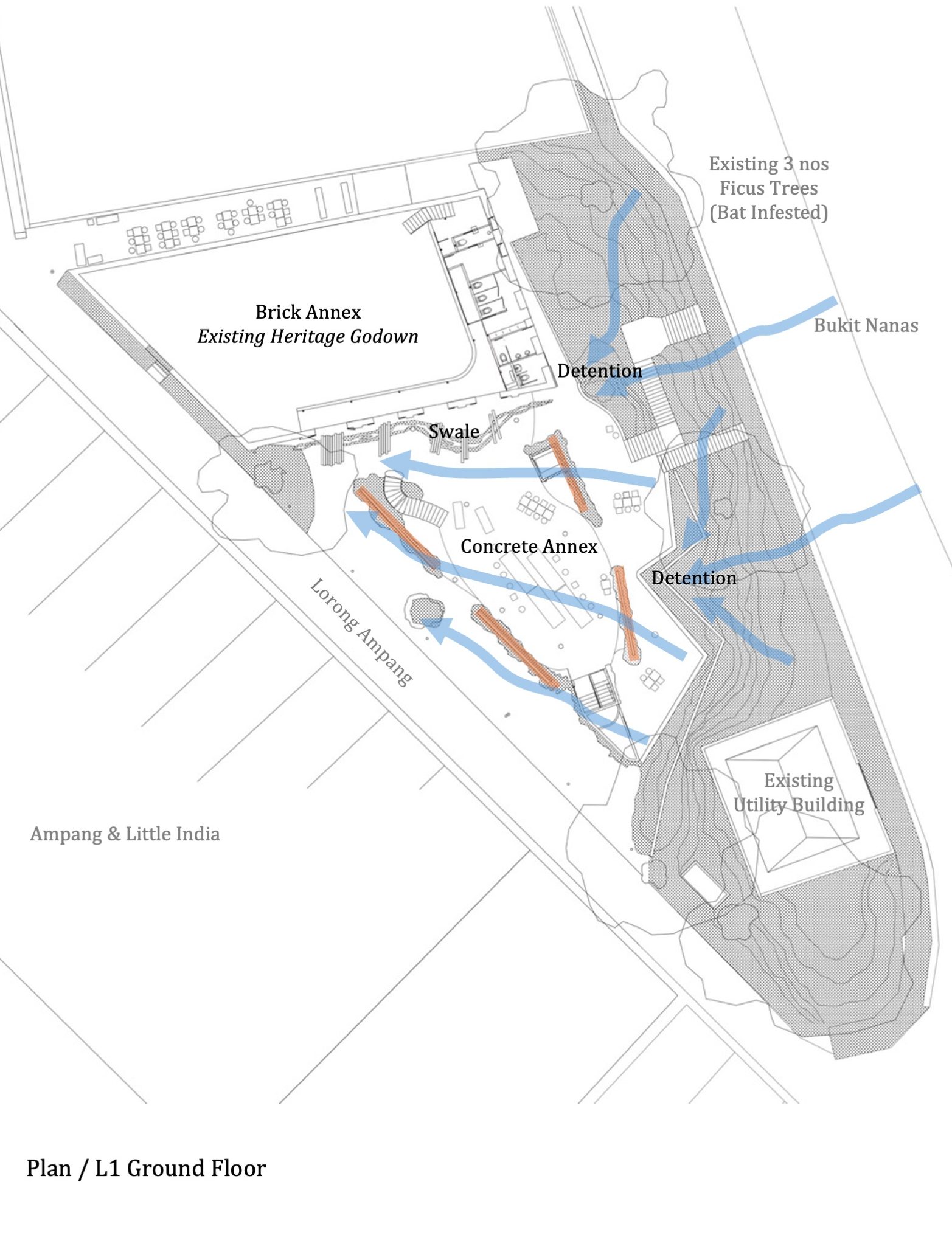 Sharing public space for culture & nature. An arts and community center in a reused colonial godown with a new extension wing. For the human, the vegetation seems as if it has always been there and nonchalant. The landscape extends existing bat habitats among the ficus trees, as well as a new refuge node for the secondary forest nearby. A swale forcefully cracks through the pavements, for monsoon rain to pass through.